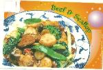 Beef and scallops with mixed vegetables in brown
